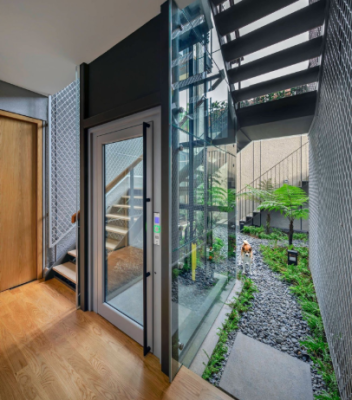 Với những căn nhà phố cải tạo có chiều sâu lớn, việc kết hợp thang máy cùng giếng trời giúp lấy sáng tự nhiên, tăng thông gió và tạo cảm giác thoáng đãng.