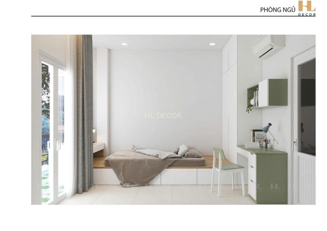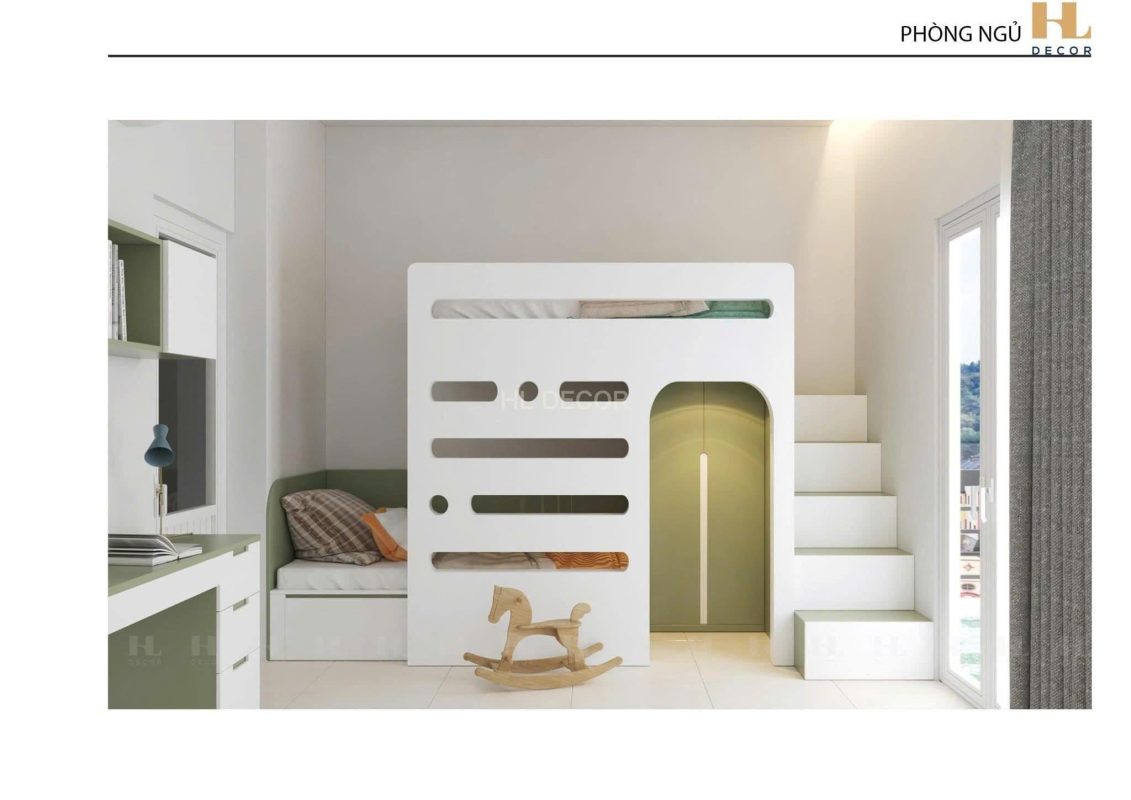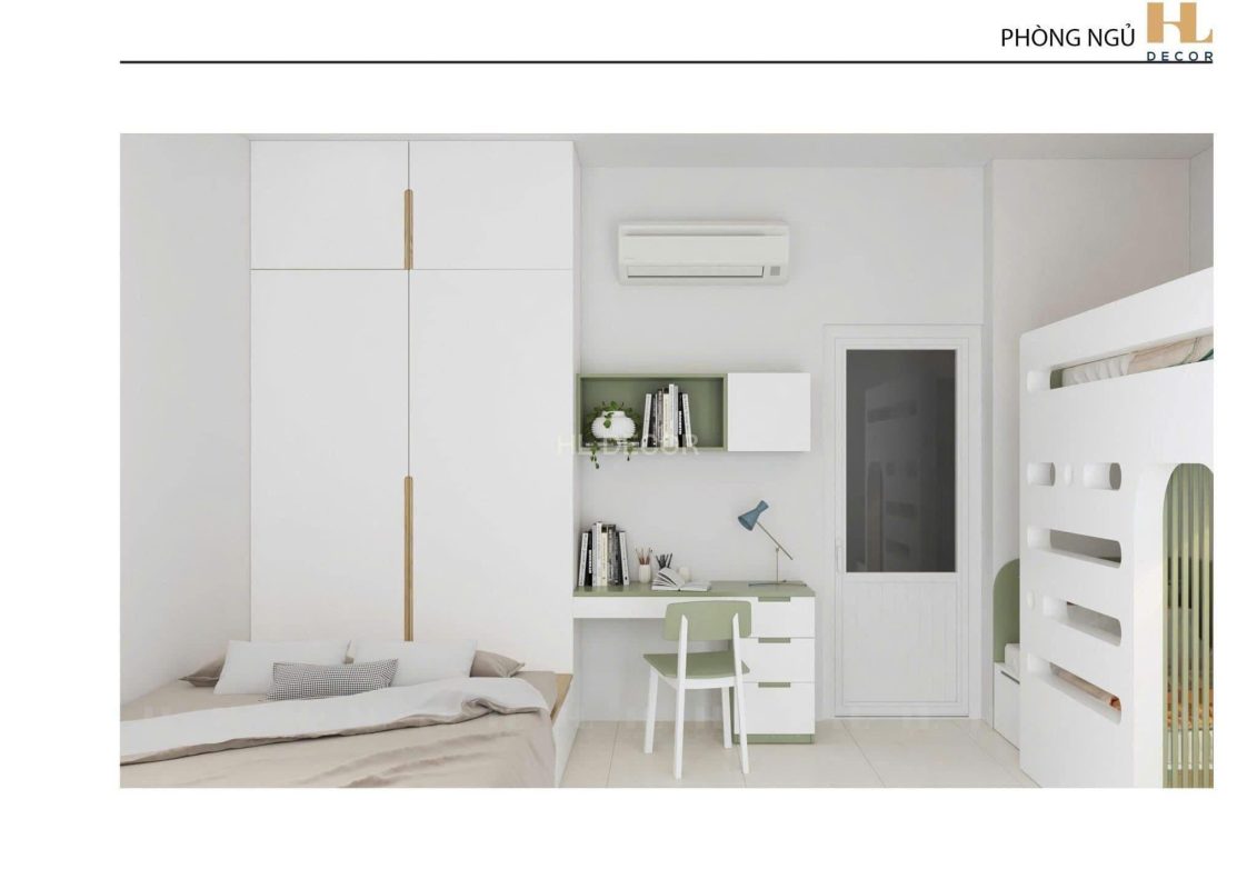 Thiết kế cải tạo phòng ngủ nhà anh Hải – Tây Sơn, 2 em bé còn nhỏ nên cần làm giường tầng và ngủ chung với cha mẹ. Dự án được thực hiện tháng 2/2024